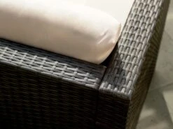 Create a comfy corner. This stylish sofa and stool combo can be arranged just the way you like. Then rearranged! Feet up with a good book or chatting with friends? The traditional, lightweight rattan patio set offers maximum flexibility. Six classic cream cushions confirm the comfort factor. Just wipe them clean with a damp cloth so keep their 'just like new' appeal.
