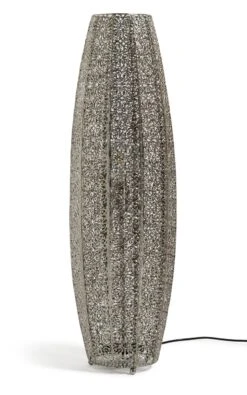Discover lighting inspired by global travels for a warm and inviting home with our Global lighting collection. It's the exquisite detailing of this metallic Global fretwork floor lamp that really sets it apart from the rest. With its decorative cut-out pattern, delicately forged with a polished nickel finish, it glimmers and gleams when it's off, and it calms and relaxes when it's on. Casting patterns of light around the room, it's a real showstopper. Matching table lamp and ceiling shade available to complete the look.