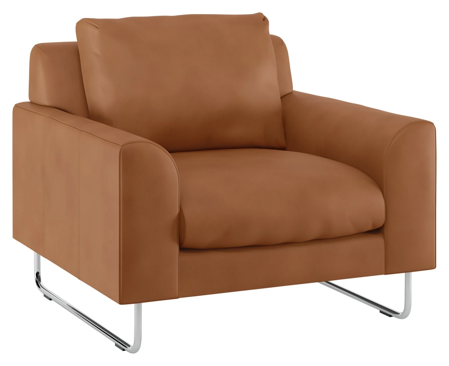 With large, squashy cushions and curved arms that soften its angular lines, the Lyle tan premium leather armchair is a relaxed, contemporary design. Perched on chromed ski legs, the inviting armchair's narrow frame allows a generous seat for its size; its cushions have a neat tucked detail on their corners and are removable for regular plumping. The armchair is hand made to order and is part of the Lyle range, available in various sizes with fabric or leather upholstery in a choice of colours.