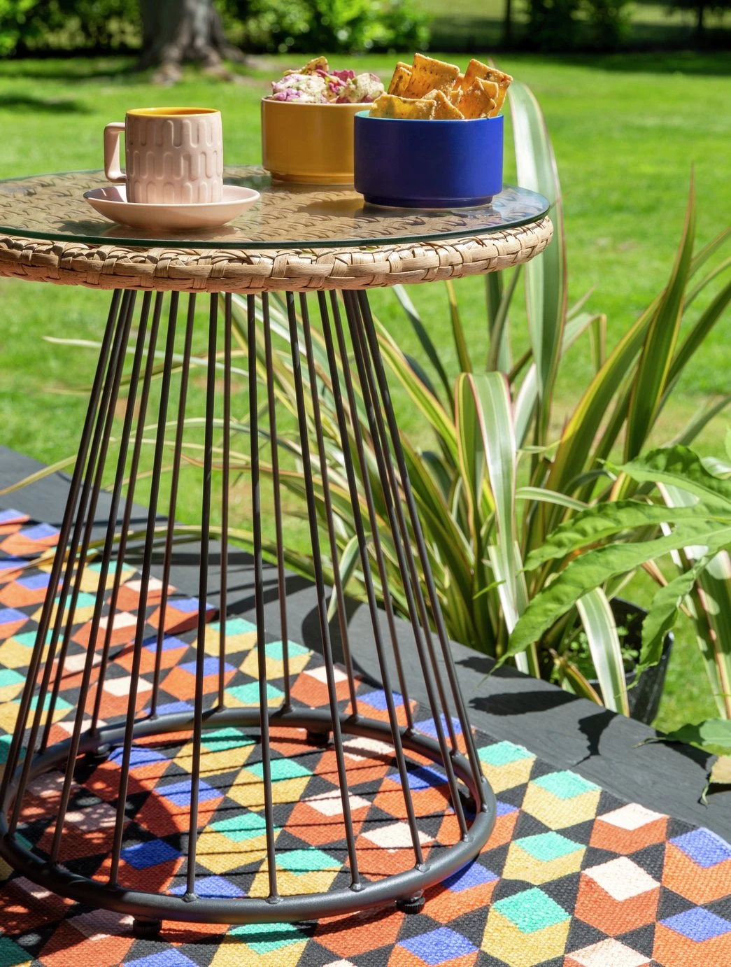 Want a pop of personality for your patio? This boho-inspired rattan garden sofa set will give you that and more. Its comfy cushioning and cocooning curves combine with elegant steel legs make these chic seats inviting and super smart. To finish the cool cafe look, 2 conical, glass topped tables make a handy resting place for your favourite tipple. The perfect antidote to a stressful day. Just add friends, fizz and a fire pit. Sunshine optional.
