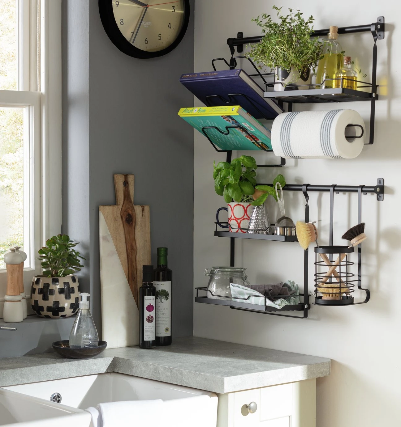 Perfect for kitchens where space is at a premium, this wall mounted storage system is a sleek way of getting your kitchen organised. Built with convenience in mind, there's room for everything! It's got a 3-tier shelf, a 2-tier shelf, a utensil pot and there's even a rack for your favourite cookery books. Made from steel, it's a sturdy and space savvy way to keep your essentials close at hand.