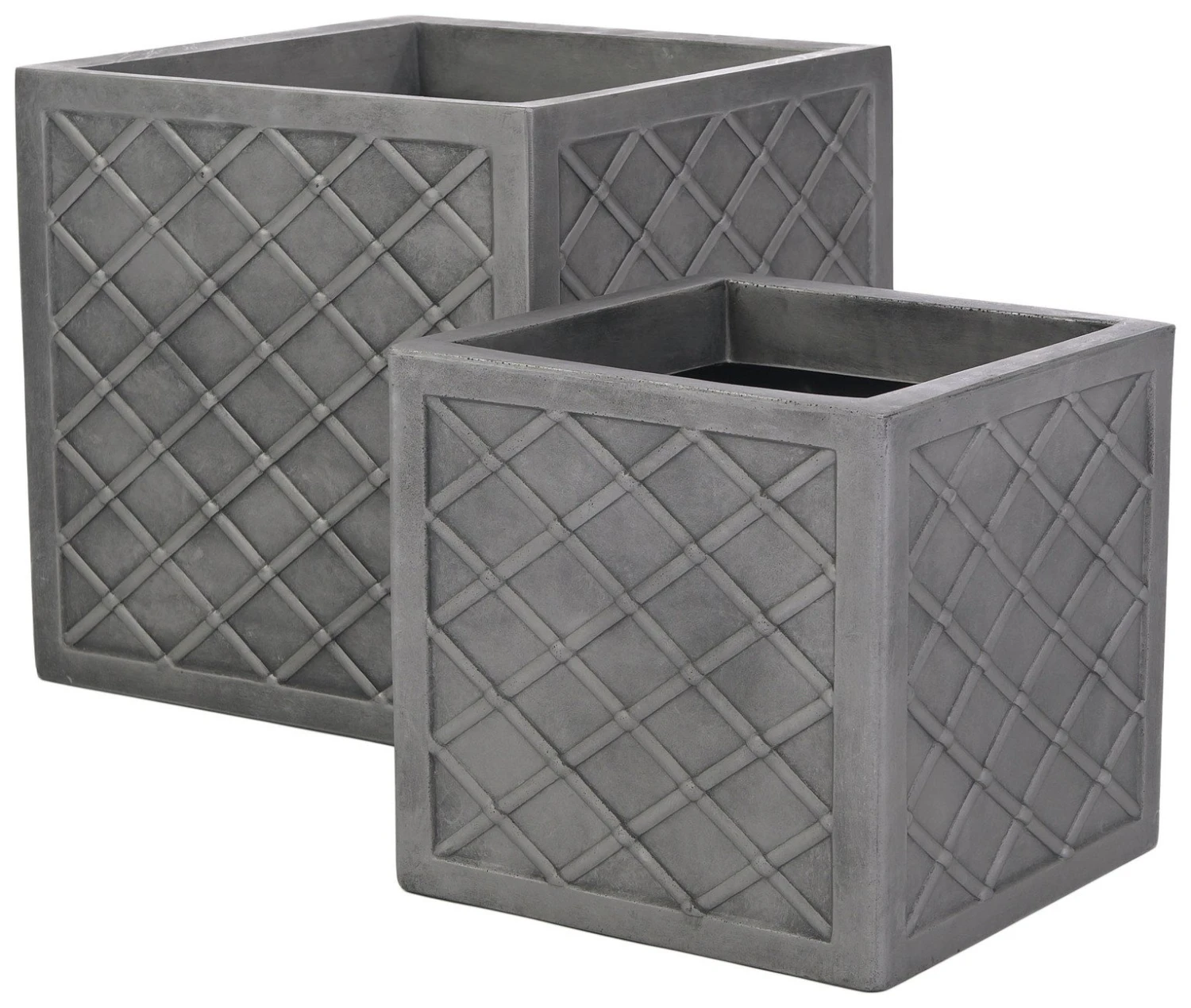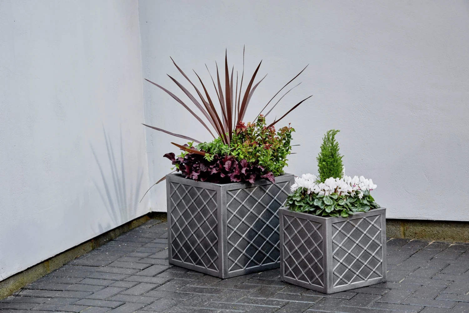 Perfect for most gardens this set of 32cm and 38cm Lazio Square Planters is great for adding some beauty to your outside areas. Hand finished to give a genuine metal look these planters are lightweight and easy to carry so you can move them around easily. Weather resistant. Made in the UK.