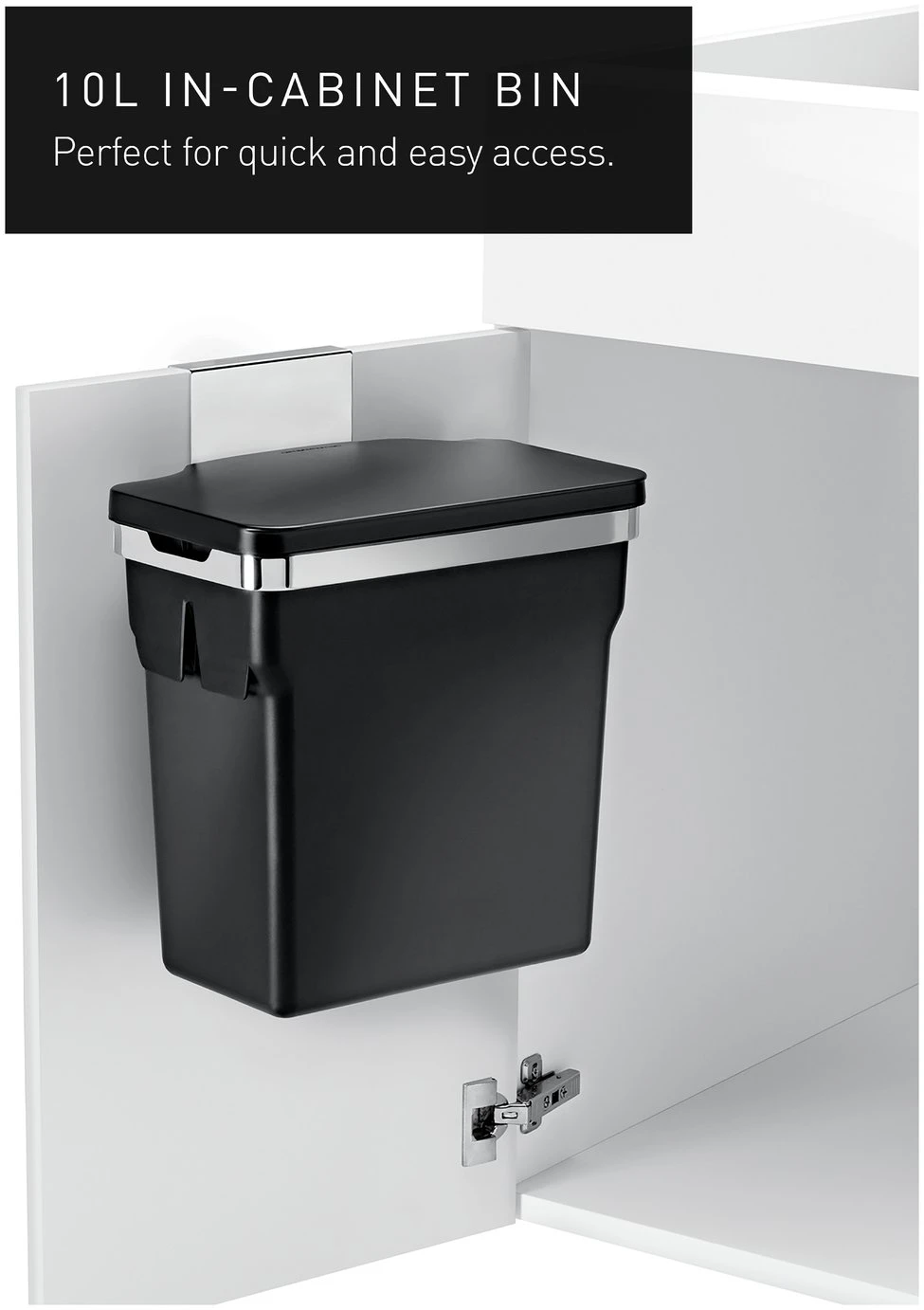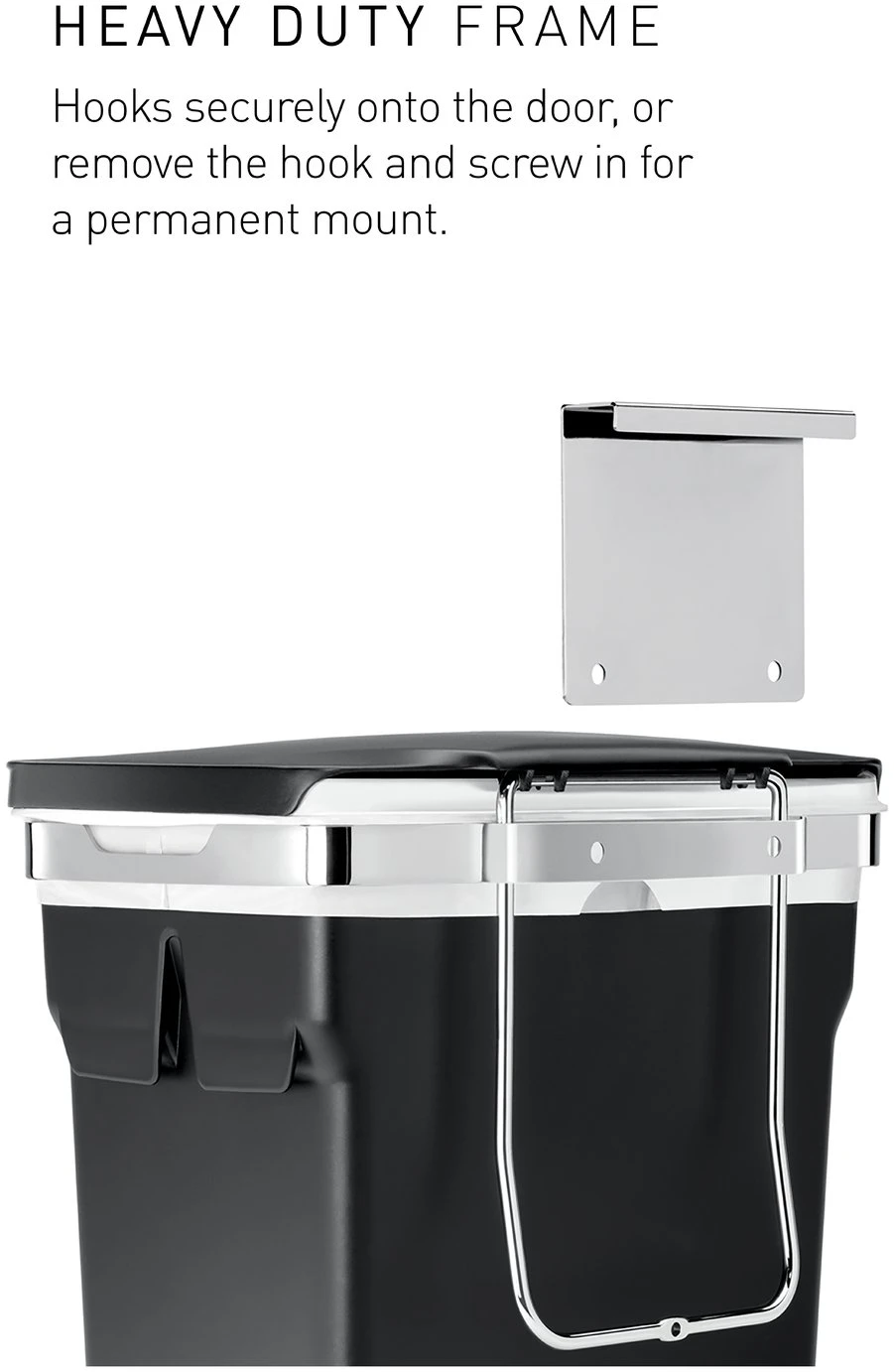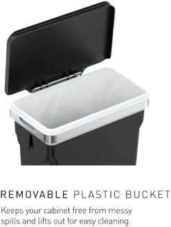 This in-cabinet bin hangs inside your kitchen cabinet door for quick and easy access while you are busy at the kitchen counter. The heavy-duty steel frame hooks securely onto the door or can be screwed in for a permanent mount. It also holds a durable plastic bucket that keeps your cabinet free from messy spills and lifts out for easy cleaning. Suitable for use in cabinets with a minimum depth of 23cm. When using the hanging bracket the top of the bin is 5cm below the top of the hanger. Watch out for pipes and other obstructions.