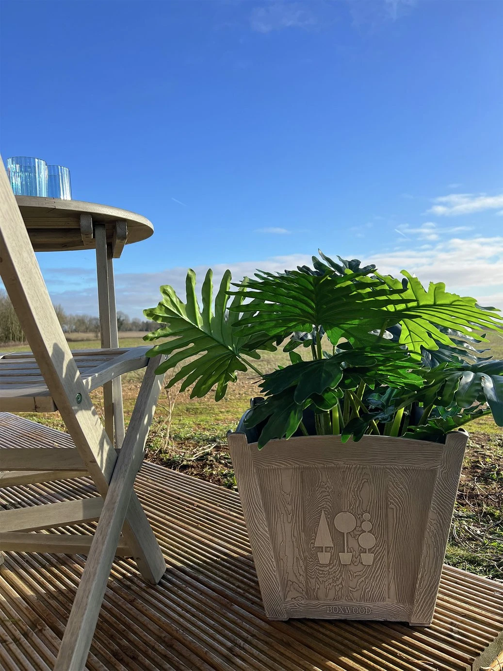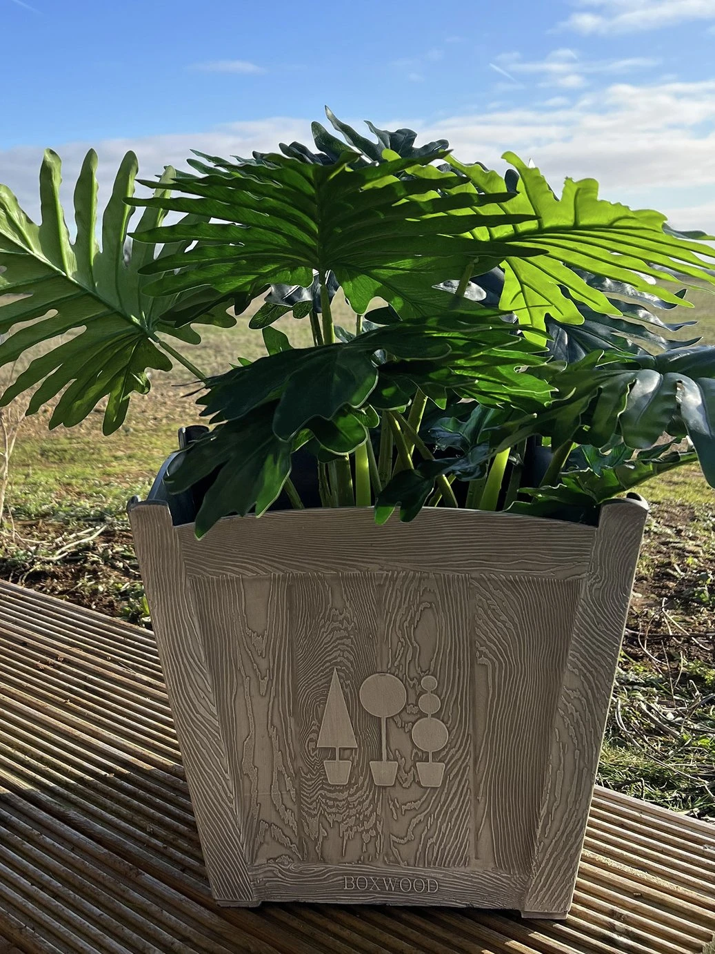100% recycled material. Practical and stylish, this square brown Boxwood Pot is ideal for creating arrangements that can be displayed indoors or outside. The functional and decorative plant pots are adorned with three tree motifs and have a contrasting terracotta effect rim. These pots are perfect for showing off your green-fingered handiwork. They are best used for displaying blooms that are planted inside a plain disposable pot. For maximum visual impact, arrange a trio of pot planters in a uniform formation.